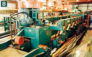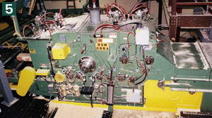 Line bored and stress relieved. 6 ½" opening with 2 shifting saws, driven press rolls and live rollers. Pneumatic lift on press rollers to accommodate larger boards.