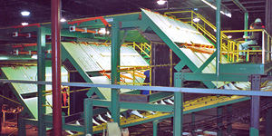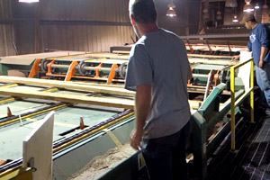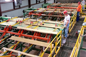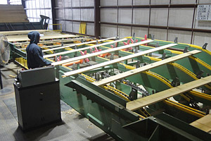 We use our patented multi-chains to feed this grading station. This results in higher pieces per minute due to smoother control of the board as it transitions over the station. The board specifications are easily determined through the use of a measuring system in the lugs in front of the grader. The grader is able to see both sides of the board and can manually re-turn it with the assistance of a grading stick. This system is capable 25+ boards per minute, and can be short coupled as shown, with a multi-chain take away. This allows higher rates of speed and center grading with a short footprint. |